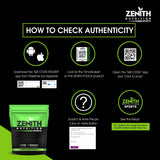 HOW TO AUTHENTICATE ZENITH SPORTS WHEY PROTEIN: 2-step verification process of QR code and Scratch code ensures the pack you receive is genuine and authentic. The product is suitable for vegetarians.